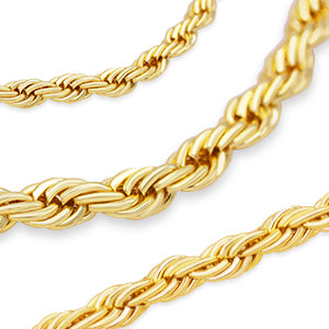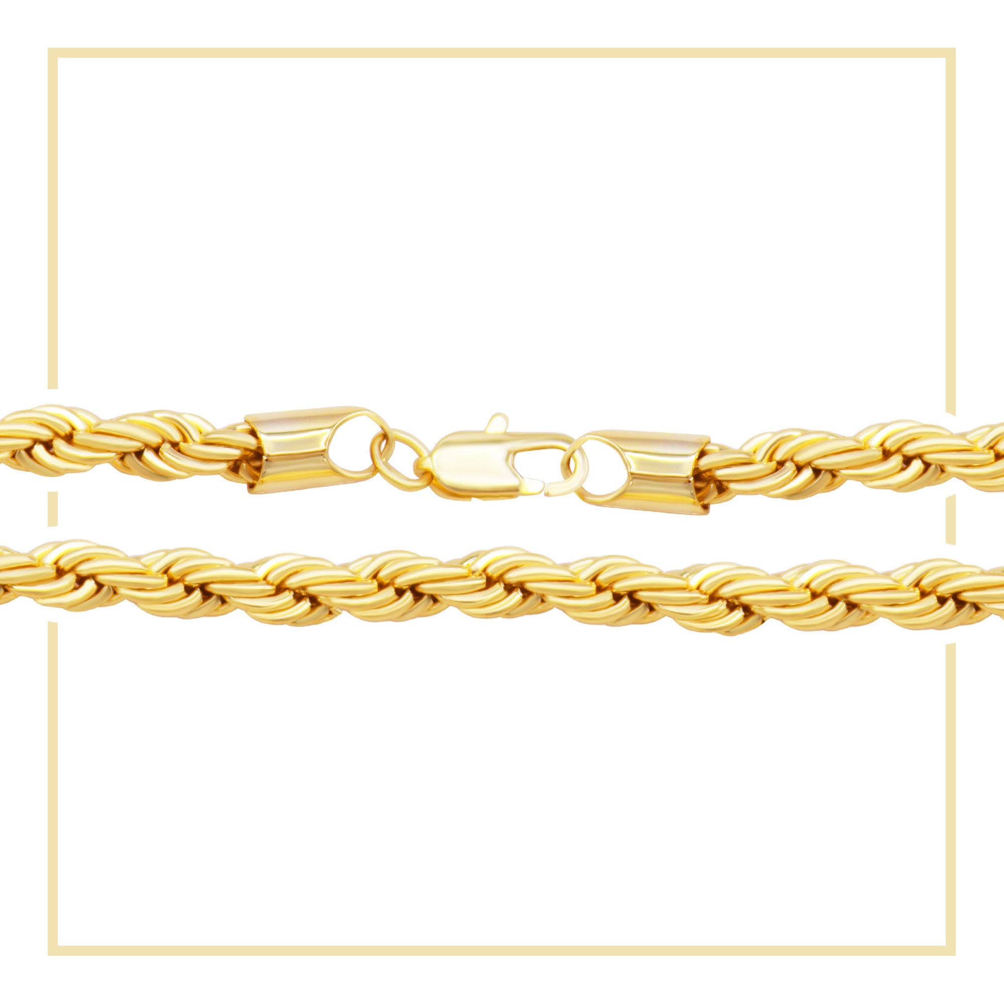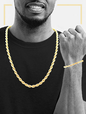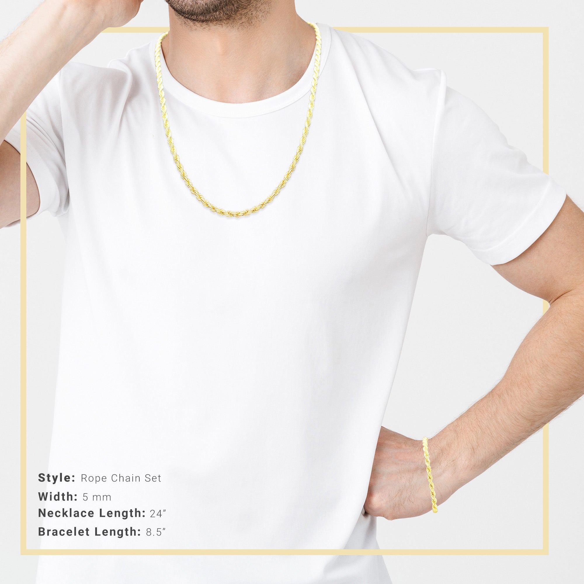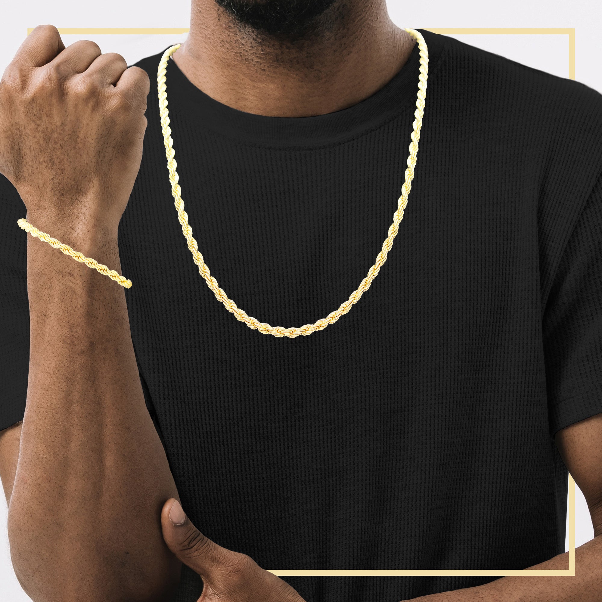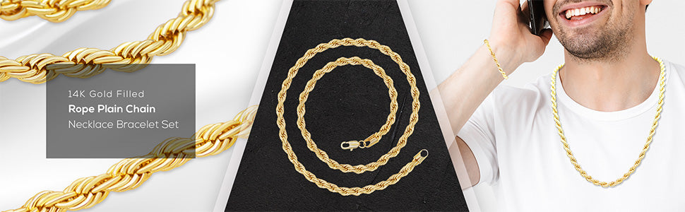 "Simple but elegant, this stylish 14K Gold Filled Rope Chain Set for men will turn heads wherever you go. Constructed with solid 14K Gold Filled copper with high polished shiny surface, our Rope chains resist tarnish, hypoallergenic, nickel free, and safe for sensitive skins.